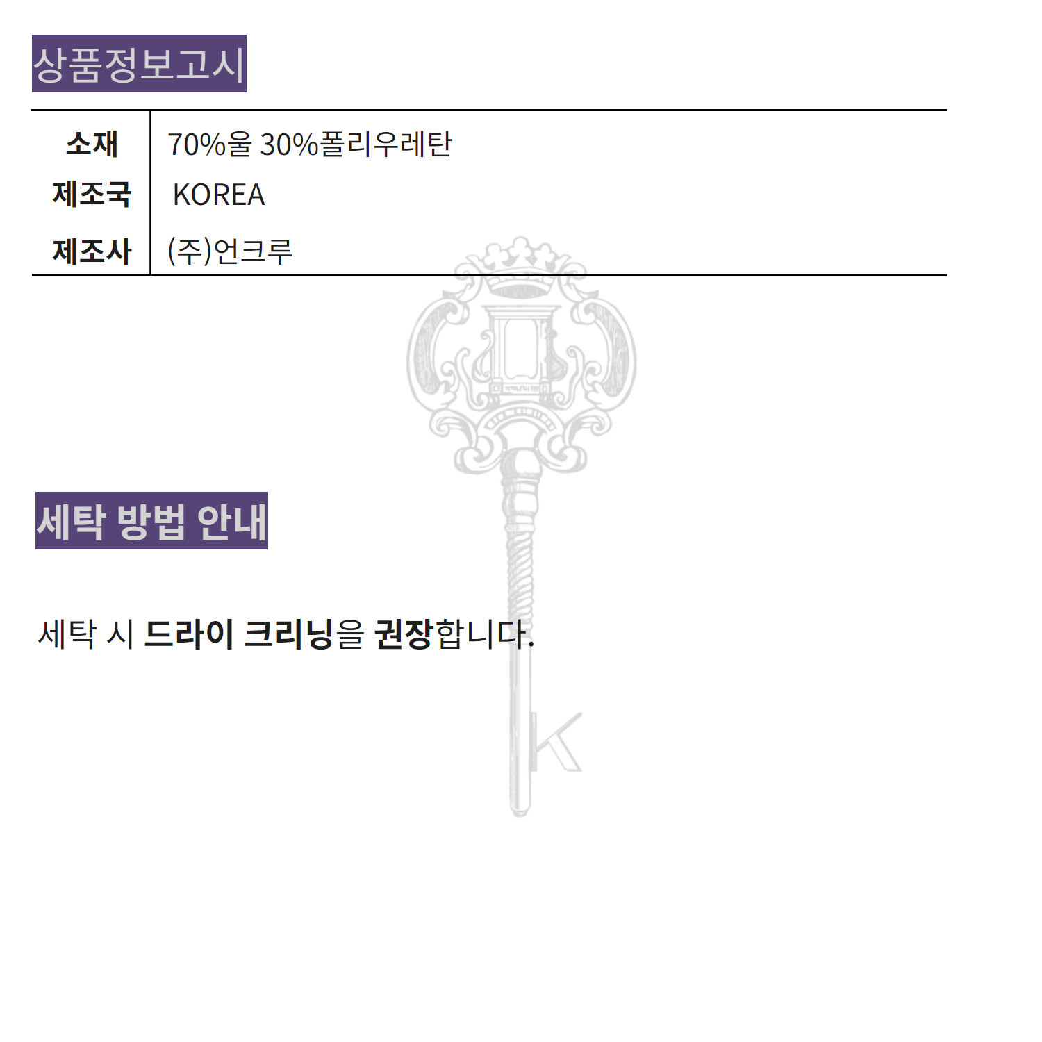 울 70% 폴리우레탄 30% 의 혼용율로